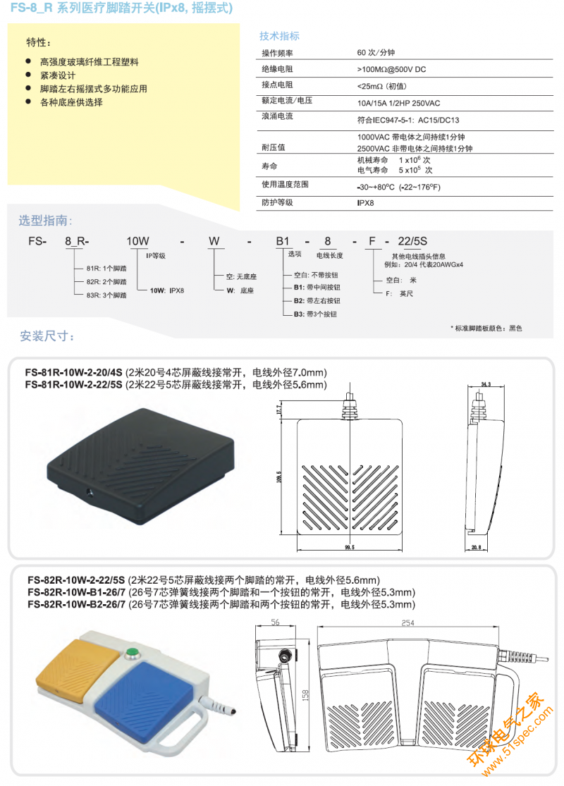 | 規格: 操作頻率 60 ops/min 絕緣電阻 >100mΩ@500V DC 接點電阻 <25mΩ(initial) 額定電流/電壓 10A/15A 1/2HP 250VAC 浪涌電流 Complies with IEC947-5-1: AC15/DC13 耐壓值 1000VAC for 1 min between current carrying parts 2500VAC for 1 min between non-current carrying parts 壽命 機械壽命 1 x106 (operations) 電氣壽命 5 x105 (operations) 使用溫度范圍 -30~+80oC (-22~176oF) 防護等級 IPX8 | |