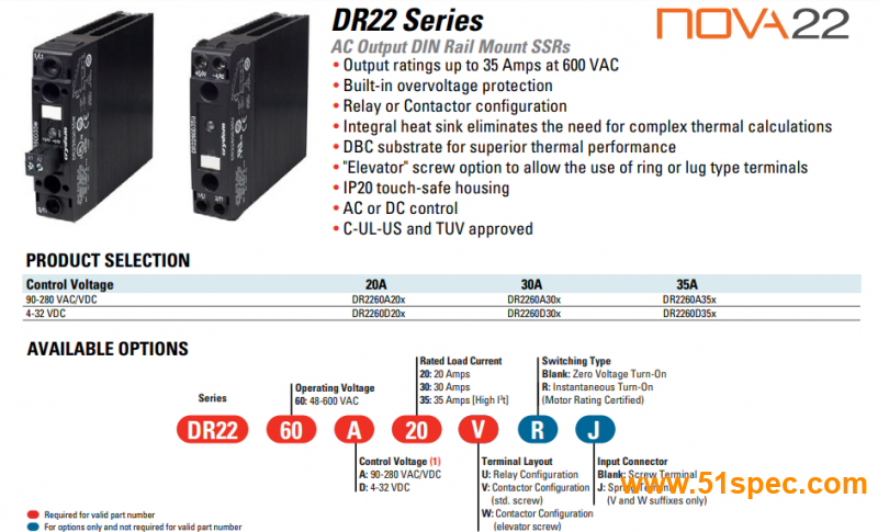| DR2260A30VR | 90-280 VAC/VDC | 30 A | 48-600 VAC | DIN Rail |