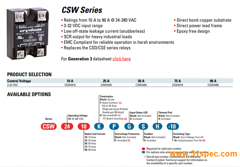 | CSW2450 | 3-32 VDC | 50 A | 24-280 VAC | Panel |